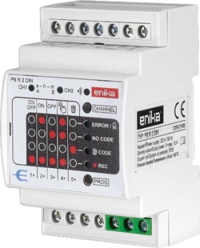 2 csatornás, DIN sínre szerelhető vevőkészülék. Az eszköz programozható, így egyszerűbb feladatoknál nincs szükség központi vezérlőegységre. A többi vevőhöz hasonlóan repeater-ként is használható nagyobb távolságok áthidalásánál.